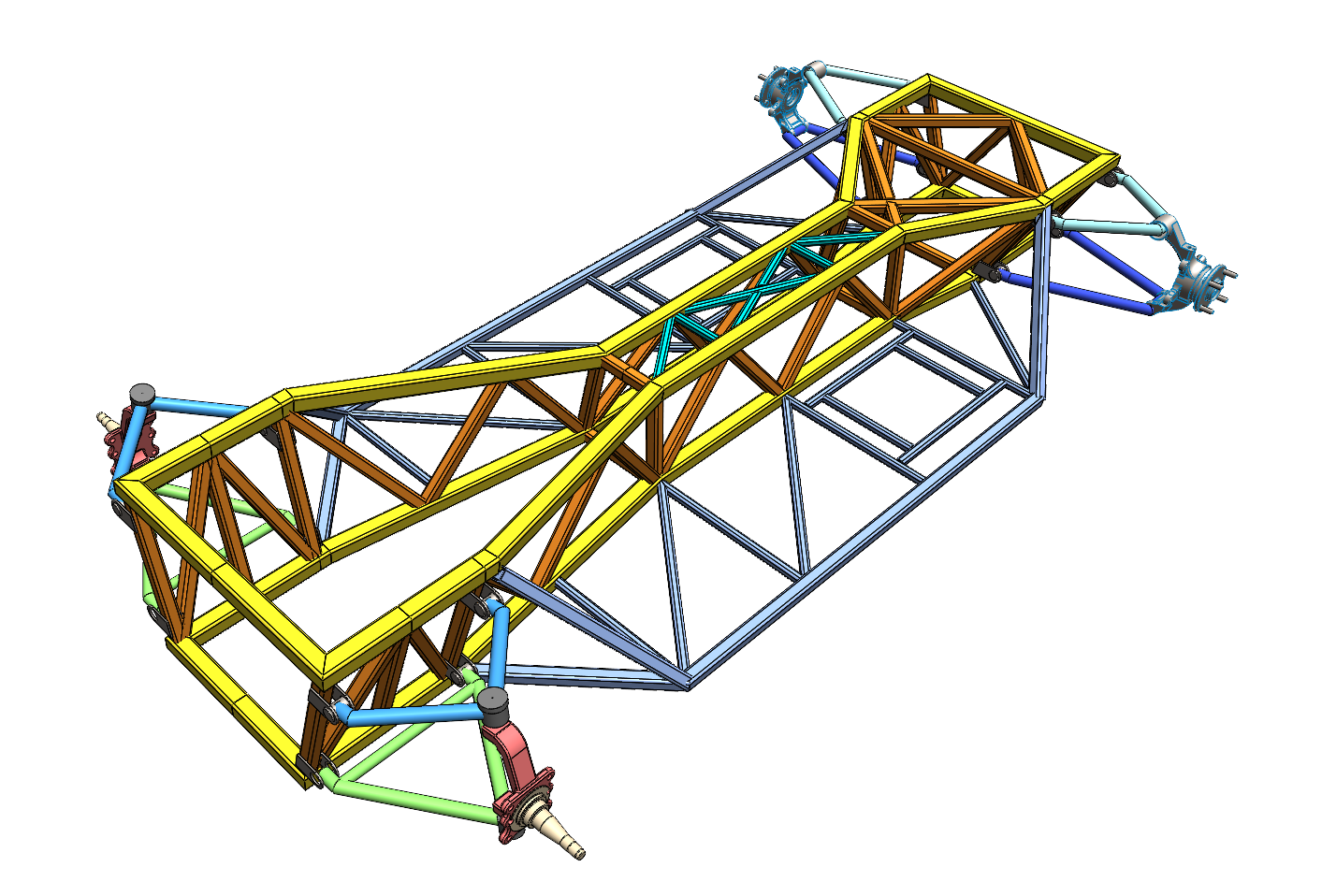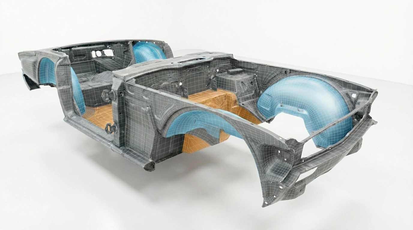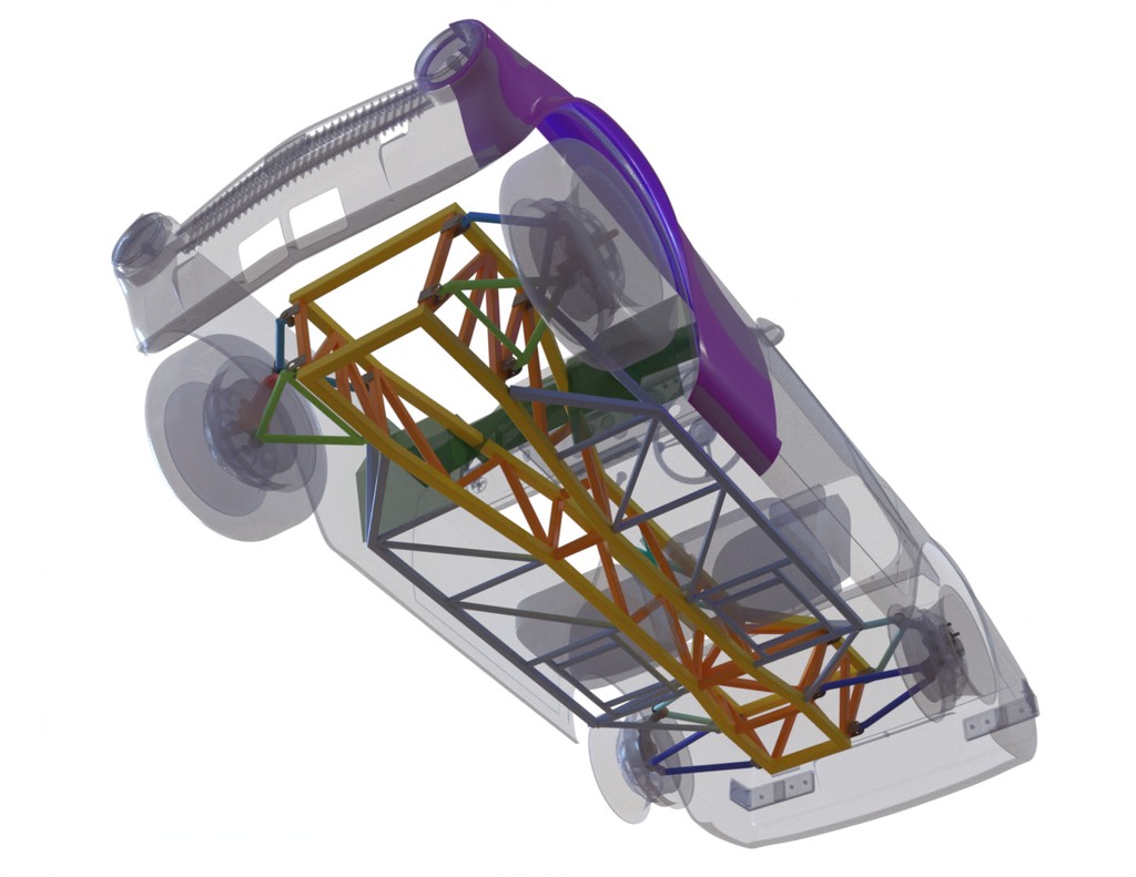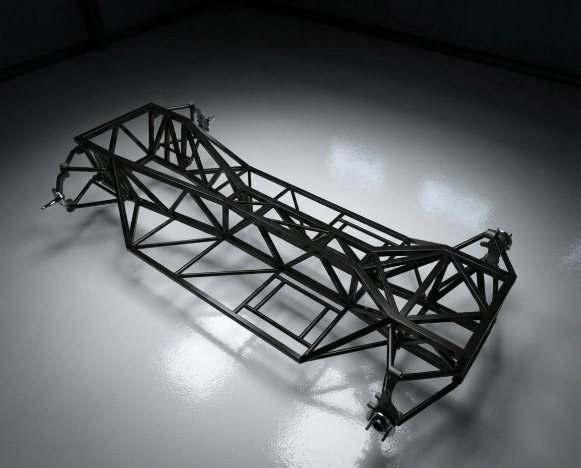 The widebody panels are a direct result of the chassis demanding greater width, while all-carbon panels reduce weight — chassis, widebody, and weight engineered together.